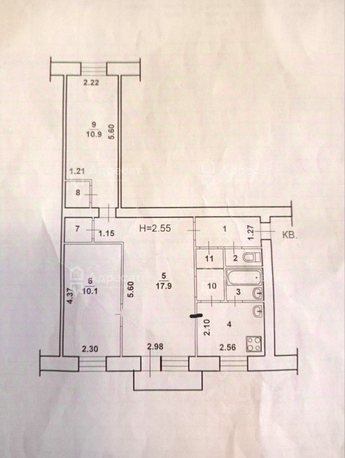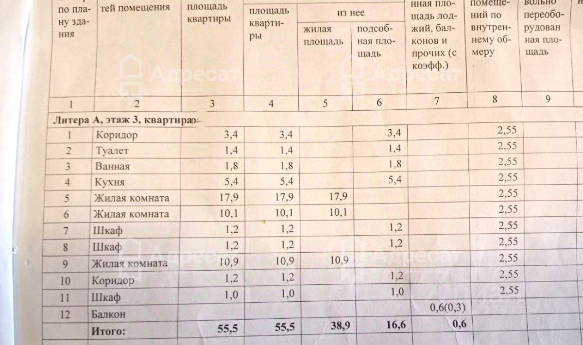 Общая площадь-55,5 кв.м.