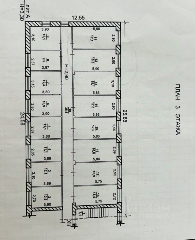 Расположен в старой и тихой части города рядом с улицей Набережная и Ленина, а так же напротив Пенсионного Фонда. Хорошее место, много зелени вокруг, есть большая парковка, помещения расположены на третьем этаже офисного здания, состоит из восьми комнат разной площади (смотри план) все помещения с отделкой, имеют общий коридор, есть санузел.