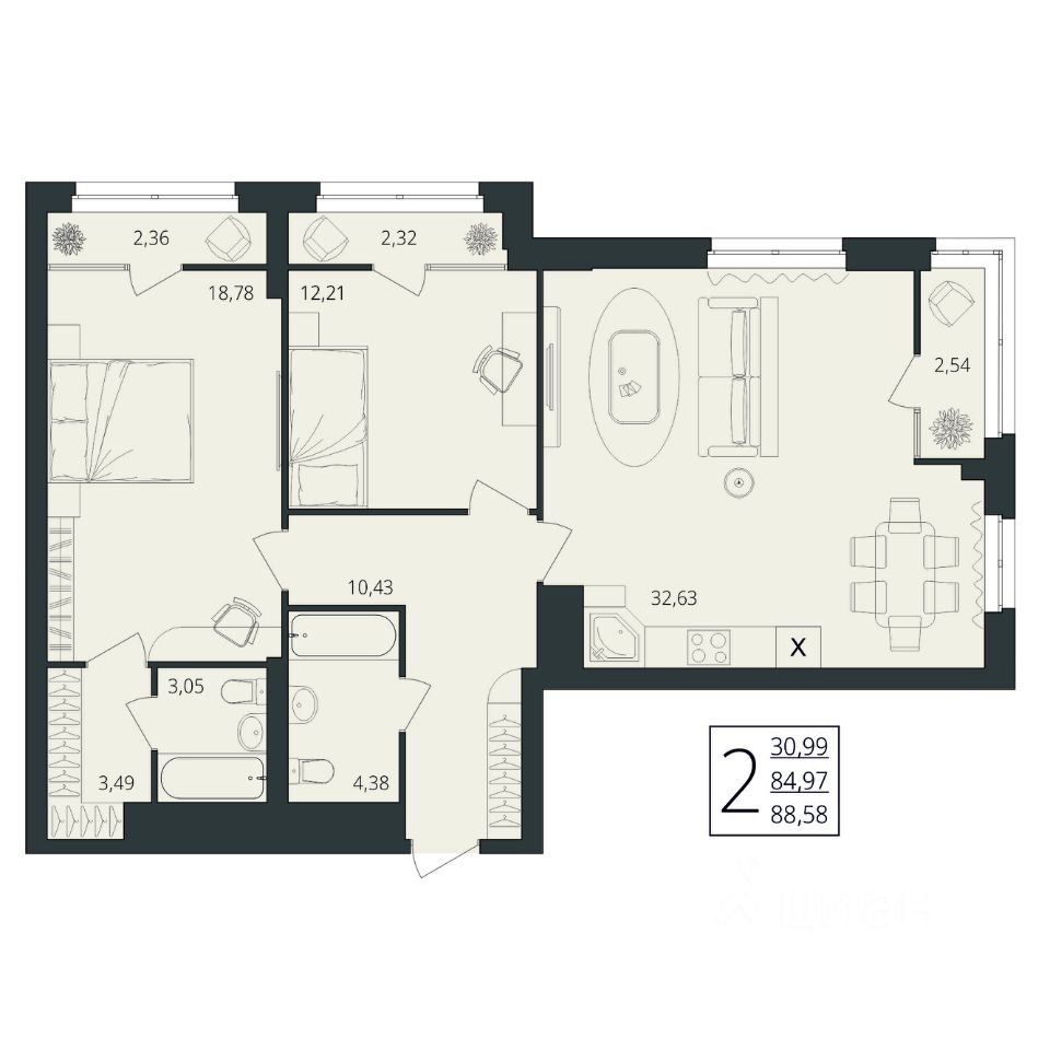 Общая площадь88,58 м2