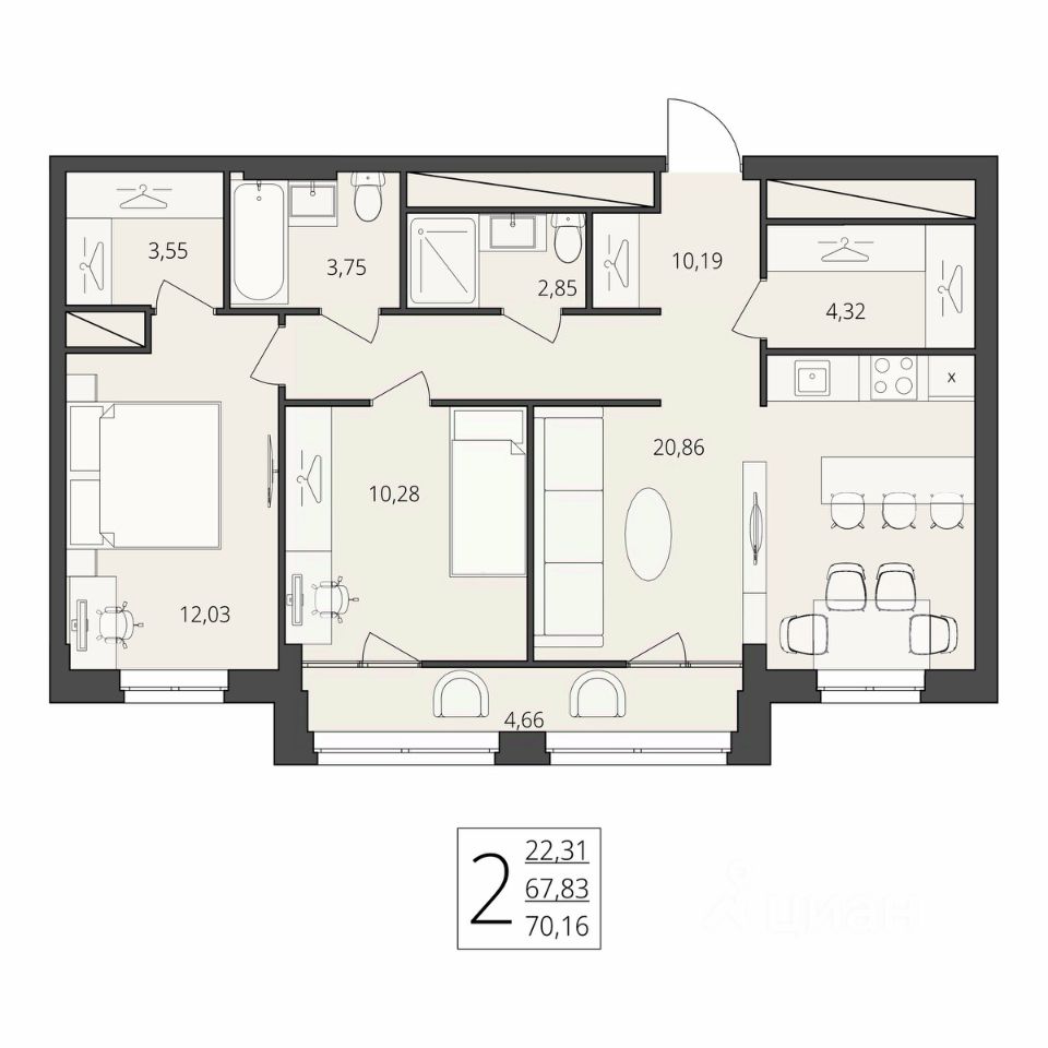 Общая площадь70,16 м2