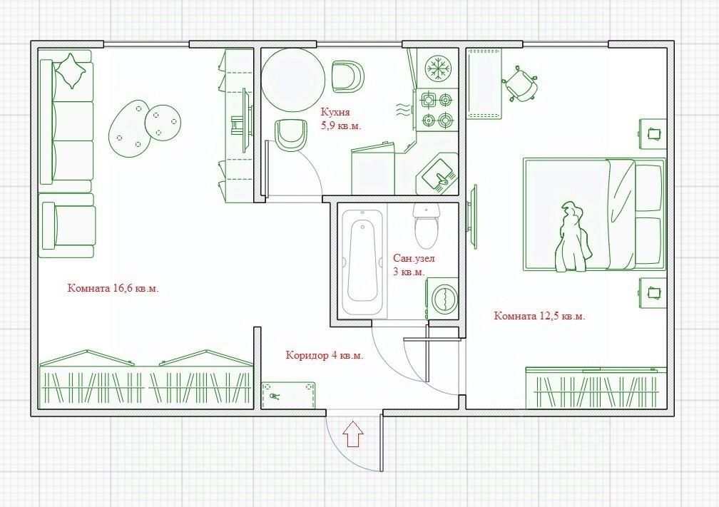 Площадь по комнатам: 16,6+12,6 кв.м.