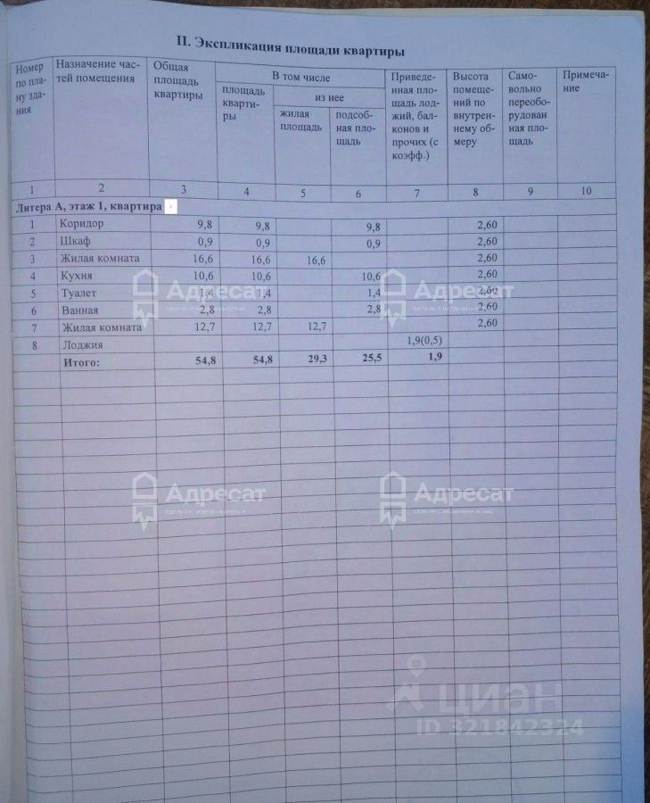 Общая площадь 54,8кв.м, жилая — 29,3 кв.м, кухня — 10,6 кв.м.