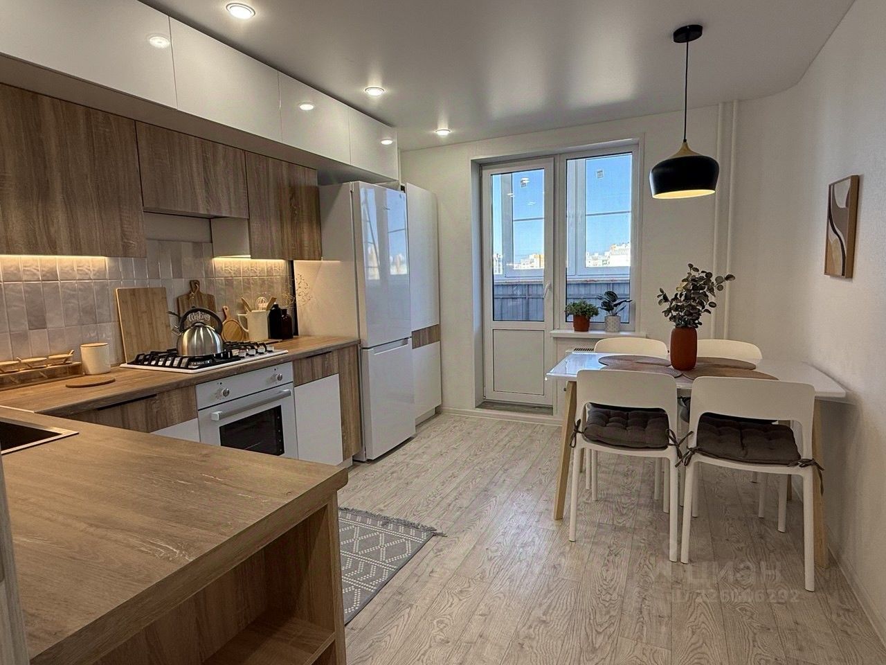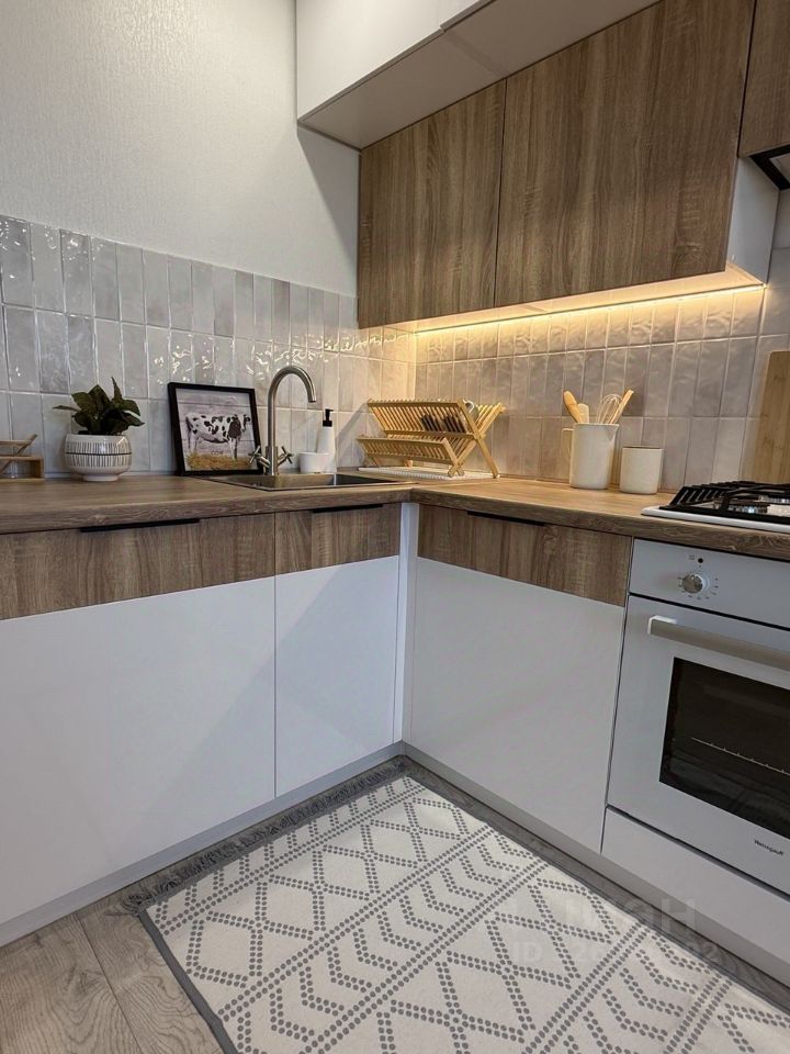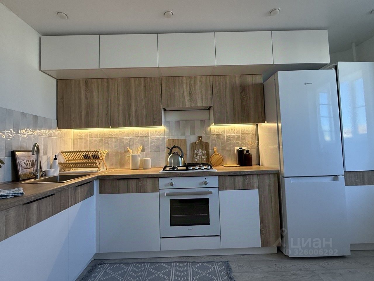 Техника: телевизор 55'', стиральная машина (7 кг), холодильник No Frost, встроенная варочная панель и духовой шкаф, вытяжка, микроволновка, сплит-система, пылесос, утюг.