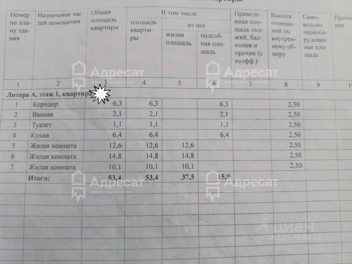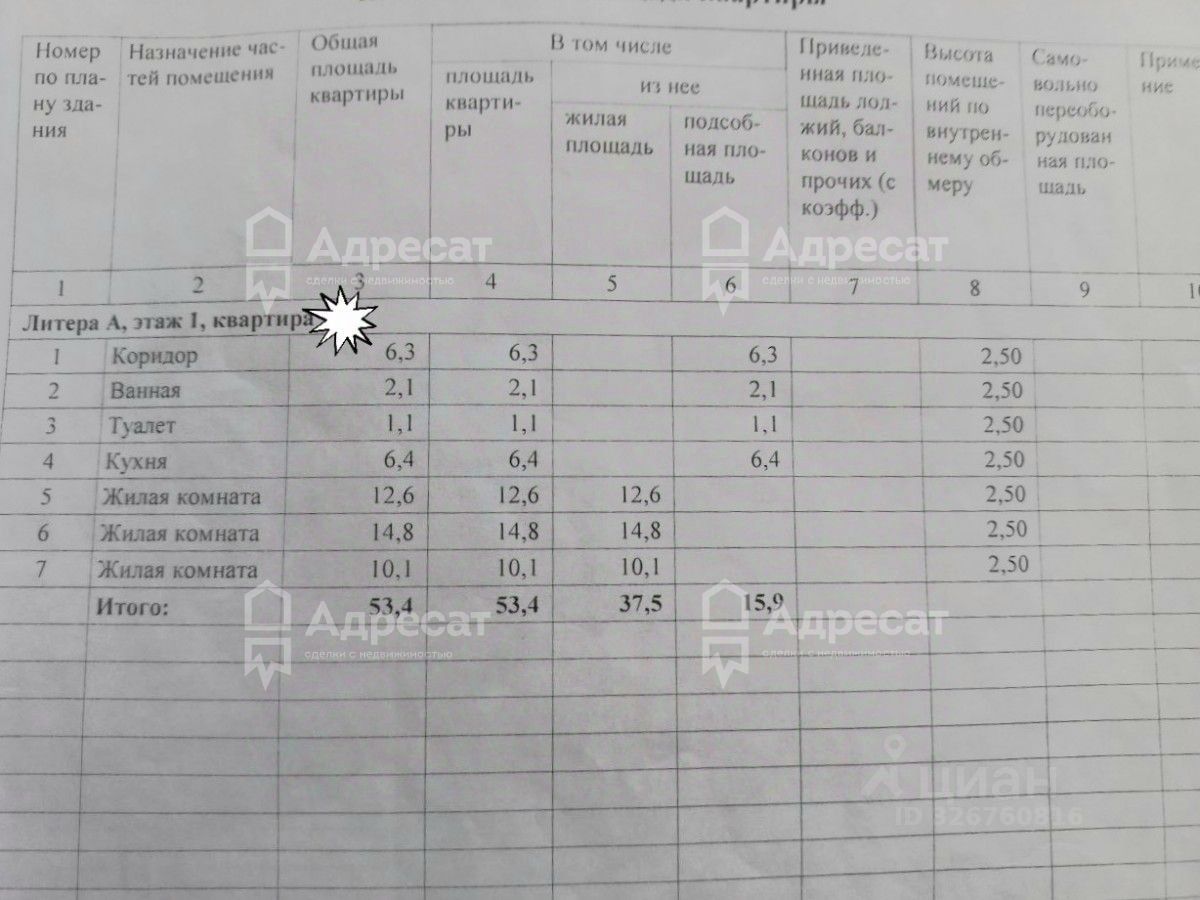 Общая площадь-53,4 кв.м. Жилая площадь- 37,5 кв.м. Кухня-6,4 кв.м.